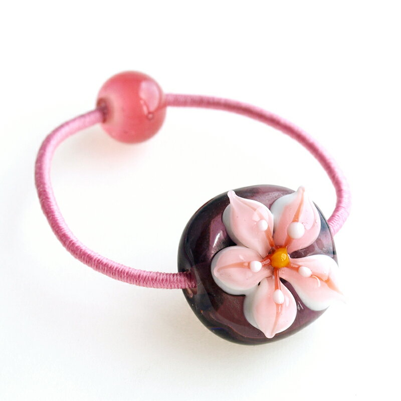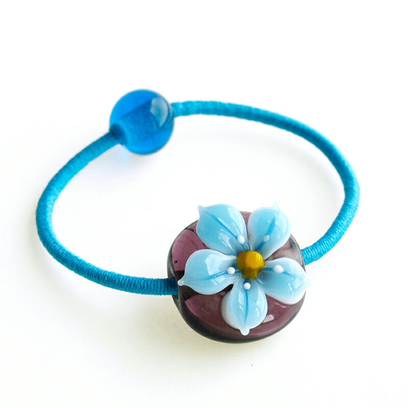 Floraのとんぼ玉は全5カラー 青花 桃花 桃紫花 赤玉+紫花 黄花 きなりがらすのヘアゴムについて きなりがらすのヘアゴムは、すべてハンドメイドのガラスのヘアゴムです。